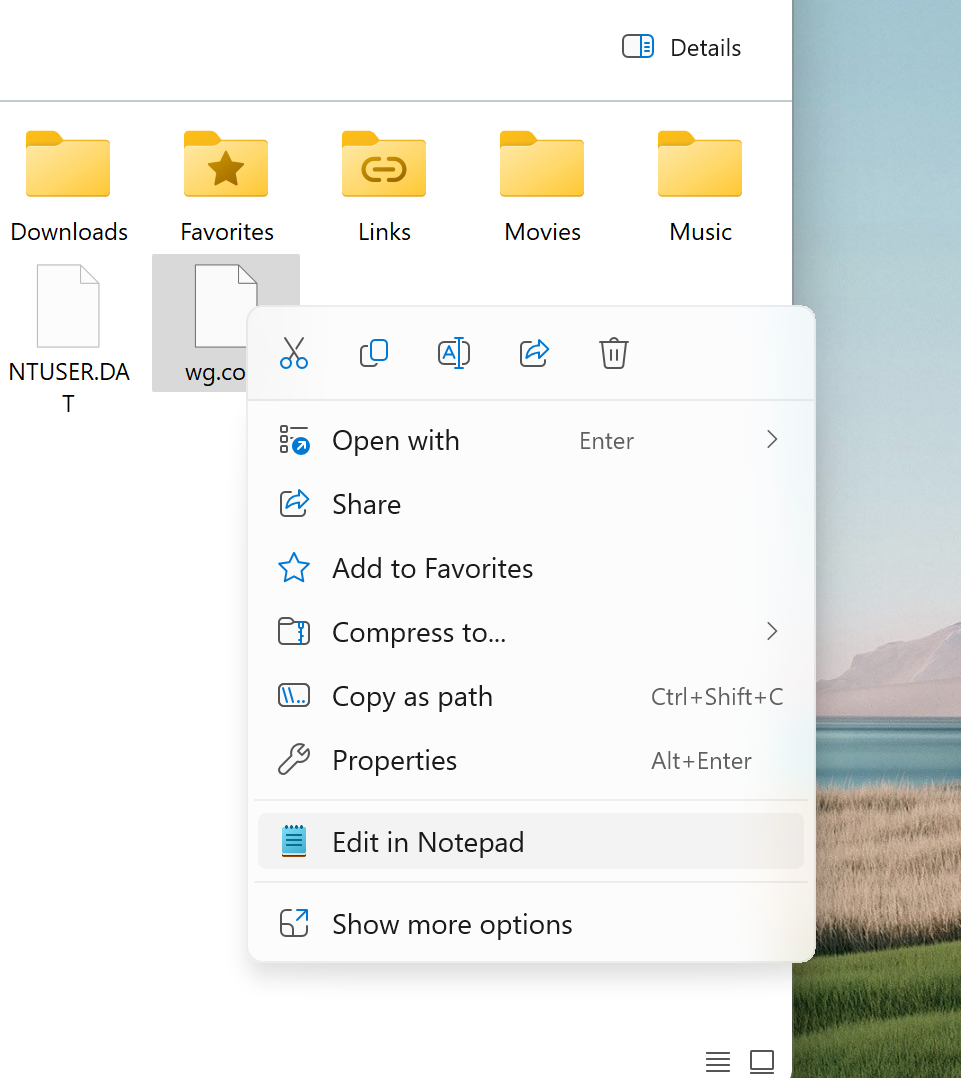 wg0.conffile and select Open with > Notepad.